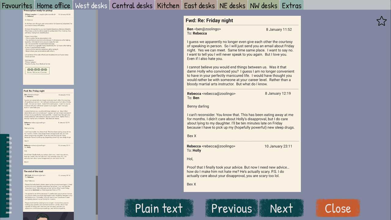 مدت زیادی از آخرین باری که بازی Roottrees را انجام دادم میگذرد، اما فکر میکنم فضای معاصر موجود در بازی A Case of Fraud باعث شد احساس قویتری نسبت به شخصیتهای آن داشته باشم – در حالی که در «Roottrees» اغلب احساس میکردید که یک بایگان هستید که در حال مرور تاریخ هستید، تاریخی که مدتها از آن جدا بودهاید، اما در اینجا متوجه شدم که در مورد افراد در مورد چیزهای نسبتاً بیضرر نظر میدهم. برای مثال، رنجش خفیفی را که از آن آدم شلختهای که لکههای قهوه روی کارت ویزیتش مانده بود و آمار فروش ضعیفتری نسبت به اعضای جوانتر بخش خود داشت، احساس کردم، یا تاسفی را که برای یک فرد بیچاره به نام پیتر احساس کردم که مجبور بود ۸۰ ساعت در هفته در یک شغل شرکتی افتضاح کار کند.