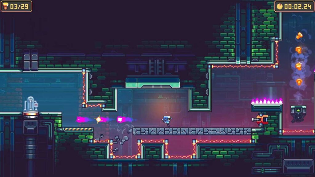 از لحاظ گیم پلی، Bzzzt هر آنچه که از یک عنوان پلتفرمر فوق العاده انتظار دارید را شامل می شود. می توانید یک درجه سختی از معمولی تا هاردکور را انتخاب کنید و سبکی از گیم پلی را انتخاب کنید که مناسب شما باشد. روند بازی از عناوین سبک “پس از مرگ دوباره تلاش کن” پیروی می کند و زمان بندی دشمنان و تله ها به قدری خوب انجام شده است که استفاده از روش اسپیدرانینگ یکی دیگر از راه های عالی برای انجام بازی است.