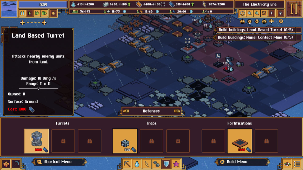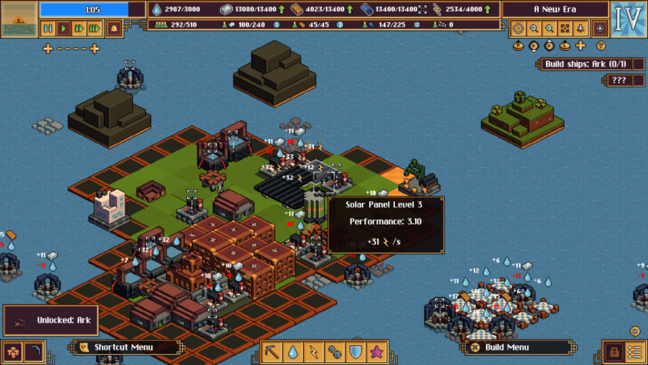 اما هنگام حمله دشمنان باید مراقب باشید زیرا برای مبارزه با کشتی ها باید برجک ها را در نزدیکی ساحل قرار دهید، اما در عین حال نمی خواهید آنها توسط دریا بلعیده شوند. یک به اصطلاح “زمین مصنوعی” به شما داده می شود که می توانید برای گسترش جزیره خود در آن بسازید، بنابراین باید مکان ساختمان های خود را اولویت بندی کنید و خطر از دست دادن فضا را در سایر نقاط جزیره داشته باشید. موارد خاصی وجود دارد که بر سرعت افتادن جزیره شما در زیر آب تأثیر می گذارد، مانند باران. اگر باران شروع به باریدن کرد، جزیره شما سریعتر شروع به غرق شدن میکند، به این معنی که شما واقعاً باید ساختمان های خود را با عجله بسازید تا از خطر آن برای مدتی کوتاه در امان بمانید.