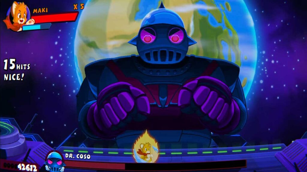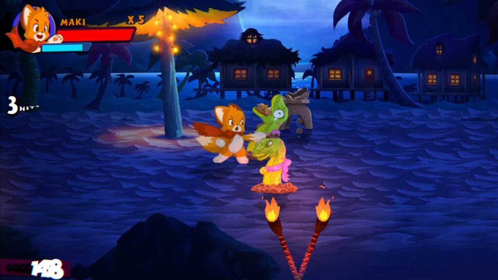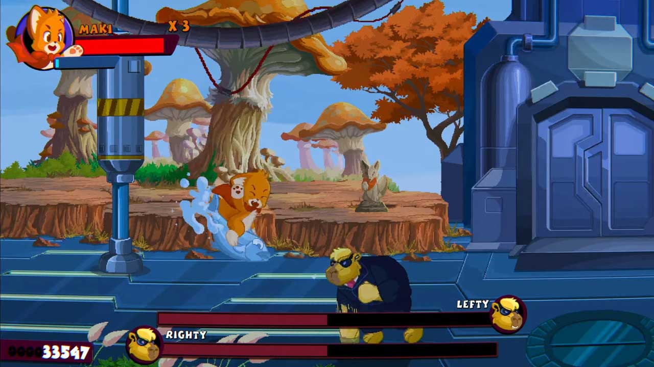 روزگاری بود که بازیهای دوبعدی beat ‘em up بسیار رایجتر از امروز بودند. وقتی یکی را دریافت میکنیم، معمولاً به مجوزی مانند اسکات پیلگریم یا لاکپشتهای نینجا جهشیافته یا انتشار مجدد یک بازی کلاسیک آرکید به عنوان بخشی از مجموعهای قدیمی مرتبط می رسیم. از این نظر، Maki با داشتن IP اصلی خودش و همچنین ارائه یک برداشت مدرن از ژانر متمایز است. متأسفانه، گیمپلی Maki نمیتواند با بازیهای قبلی خود در دهه 90 میلادی مطابقت داشته باشد. سه شخصیت قابل بازی جداگانه وجود دارد و ظاهراً همه آنها الگوهای حمله منحصر به فردی را ارائه می دهند. با این حال، بدون ارتقاء یا توانایی برای کسب درآمد و بدون حس پیشرفت واقعی، همه آنها به یک مزخرف خرد کردن تک دکمه خلاصه می شوند و هیچ قابلیت پخش مجدد وجود ندارد.