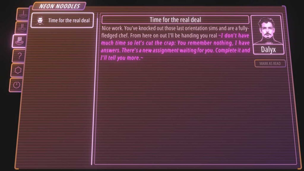 این روایت جذاب در یک بازی پازل شبیهساز آشپزی با نامی مشابه شرکت مذکور، Neon Noodles، گنجانده شده است. غذا نمادی از ثروت و قدرت است که با این مجموعه از طعمهای شدید و در عین حال تحویل سریع، تجسم مییابد. نقش شما در همه اینها؟ خب، این چیزی است که باید به خاطر داشته باشید. شما که دچار فراموشی مرموز و پیامی بسیار مرموزتر شدهاید، در یک ماموریت جسورانه برای بازپسگیری میراث خود و به جا گذاشتن ردپای خود در دنیای آشپزی لوکس قرار میگیرید. حالا دقیقاً چگونه به همه اینها دست مییابید؟ در ادامه پاسخ خواهیم داد.