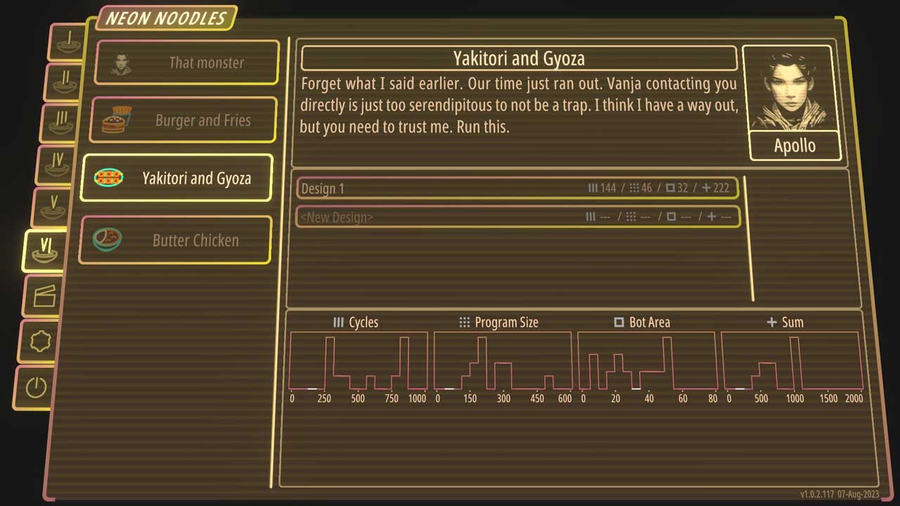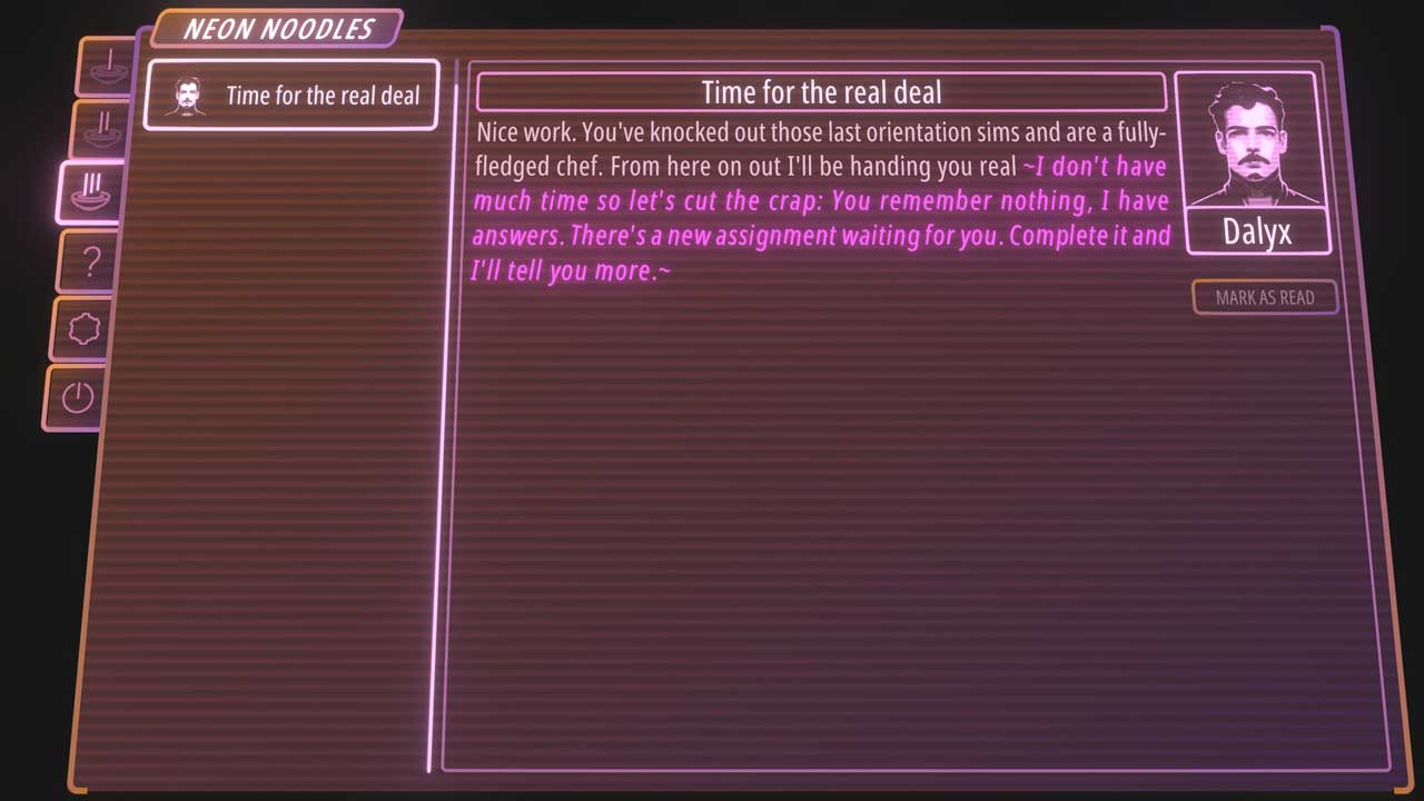 این روایت جذاب در یک بازی پازل شبیه‌ساز آشپزی با نامی مشابه شرکت مذکور، Neon Noodles، گنجانده شده است. غذا نمادی از ثروت و قدرت است که با این مجموعه از طعم‌های شدید و در عین حال تحویل سریع، تجسم می‌یابد. نقش شما در همه اینها؟ خب، این چیزی است که باید به خاطر داشته باشید. شما که دچار فراموشی مرموز و پیامی بسیار مرموزتر شده‌اید، در یک ماموریت جسورانه برای بازپس‌گیری میراث خود و به جا گذاشتن ردپای خود در دنیای آشپزی لوکس قرار می‌گیرید. حالا دقیقاً چگونه به همه اینها دست می‌یابید؟ در ادامه پاسخ خواهیم داد.