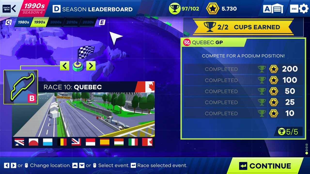 هر دهه با ده مسابقه اصلی GP همراه است. اگر خوب عمل کنید و در آن ها رقابت کنید و پیروز شوید، به راحتی می توانید مسابقه های دهه های آینده را هم تجربه کنید. توسعه دهنده New Star Games تلاش کرده است اطمینان حاصل کند که یک دور از هر مسیر مسابقه ای این بازی تقریباً یک دقیقه طول می‌کشد، بنابراین با دورهای محدود، اکثر رقابت ها می توانند در مدت شش دقیقه یا بیشتر به پایان برسند – البته حداقل اگر مهارت های رانندگی شما اجازه دهند.