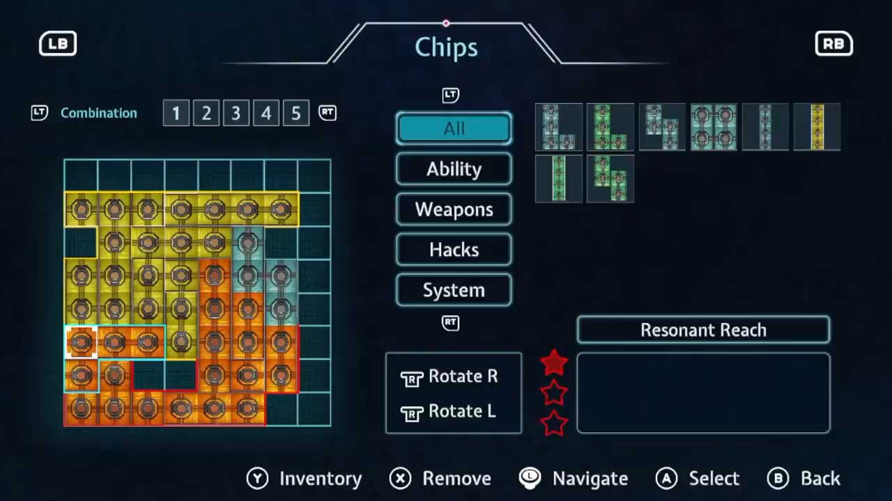 احتمالاً بخش مورد علاقه من در طراحی بازی این است که چگونه توانایی های خود شخصیت ReSetna را بهبود می بخشید. شما یک شبکه دارید که در آن تراشه هایی با رنگ ها و اشکال مختلف مانند تتریس را قرار می دهید. هر تراشه یکی از آمار یا توانایی‌های ReSetna را تقویت یا ارتقا می‌دهد و به شما این امکان را می‌دهد که بیلدهای خود را ایجاد کنید. وجود تراشه‌هایی از رنگ‌های منطبق در کنار یکدیگر، تأثیرات آن‌ها را افزایش می‌دهد. افزایش اندازه شبکه و برخی از تراشه ها را می توان در یک مرکز اصلی خریداری کرد، در حالی که برخی دیگر را می توان در خود جهان پیدا کرد.