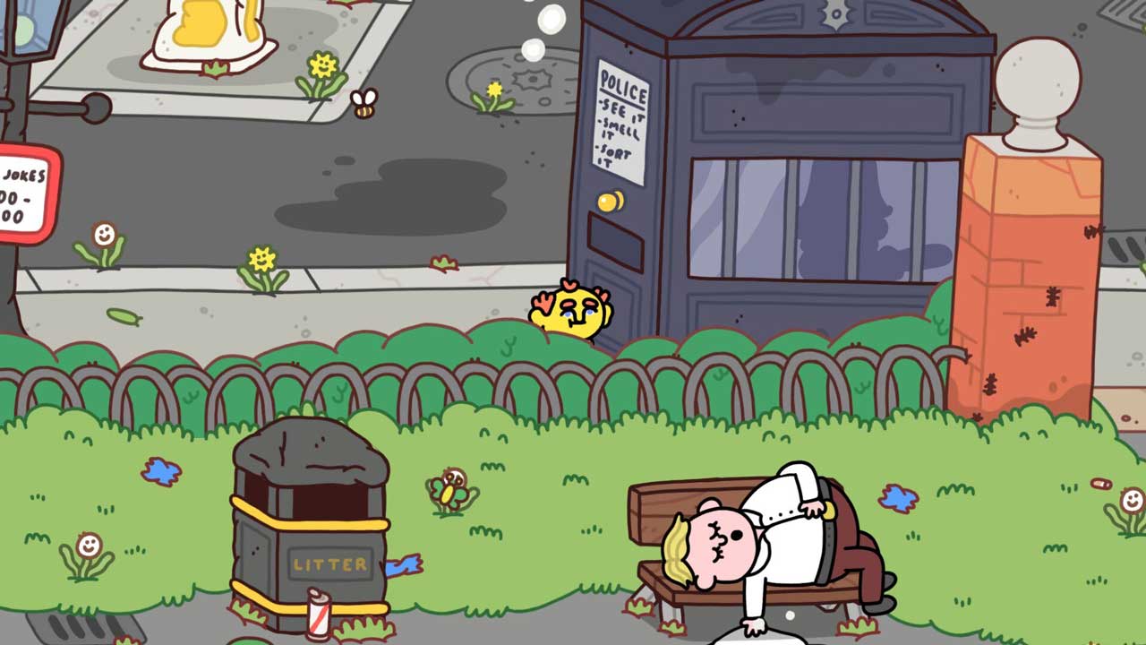 با انجام این کار، نه تنها با طیف گستردهای از مردم شهر ملاقات میکنید، بلکه ماموریتهایی نیز دریافت میکنید. این ماموریتها به هیچ وجه قابل سنجش نیستند. شما هیچ سیستم موجودی، هیچ دفترچه ماموریتی و مطمئناً هیچ پاداشی ندارید. چون بازی «Thank Goodness You’re Here!» یک شبیهساز پیادهروی باشکوه با توهم انتخاب است، اما فکر میکنم این کار را به روشی بسیار هوشمندانه انجام میدهد.