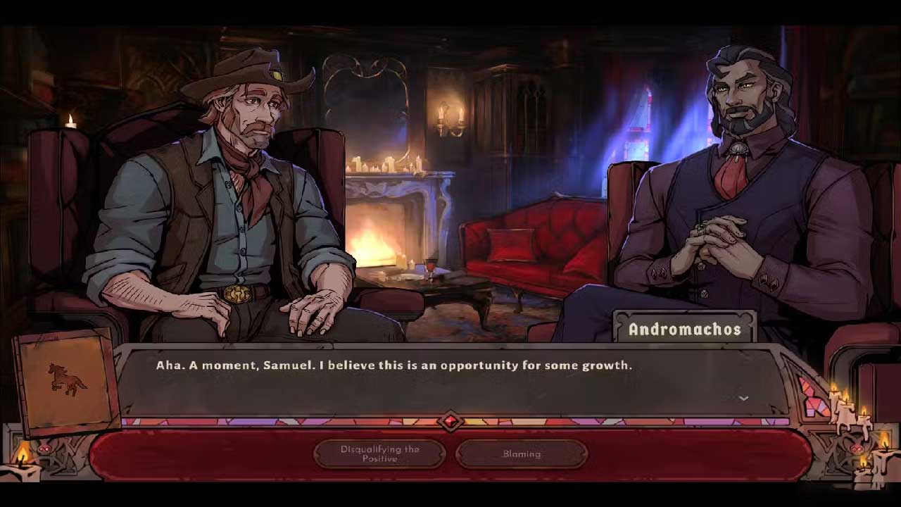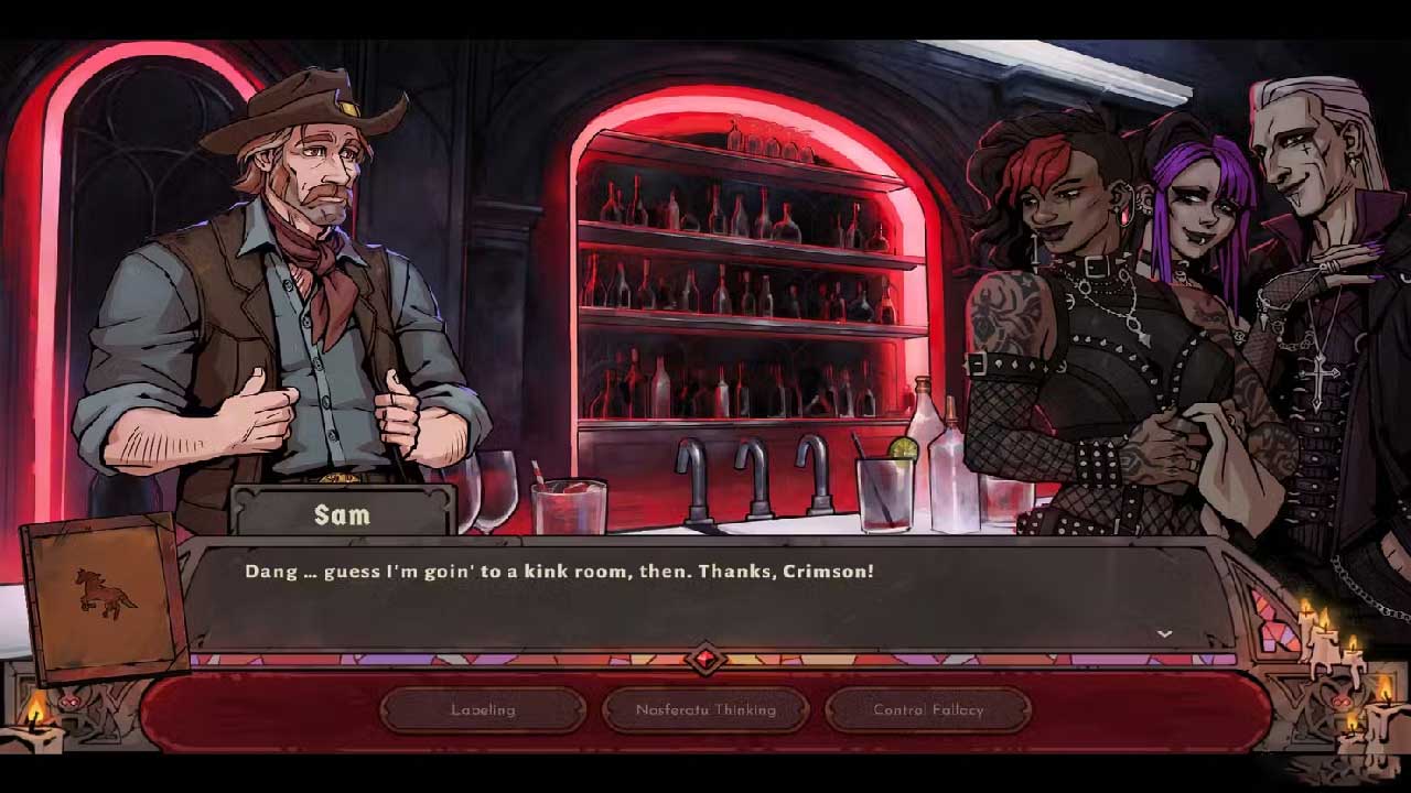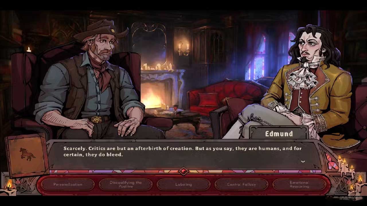 ترکیب یک رمان بصری مبتنی بر خون آشام با مفاهیم بسیار واقعی و کاملاً آگاهانه از درمان شناختی رفتاری از همان ابتدای بازی یک ایده مخاطره آمیز بود، اما من پس از مدتی متقاعد شدم که این یک تجربه خوب و متعادل است. در اینجا چیزی شبیه به اتکای بیش از حد به ترکیب مفاهیم CBT (درمان شناختی رفتاری) به عنوان مکانیک گیم پلی وجود دارد که منجر به گفتگوهای عجیب و غریب با افرادی می شود که به روش های بسیار غیرطبیعی به “گفتار درمانی” صحبت می کنند، اما به نظر می رسد که این یک ویژگی اجتناب ناپذیر بازی است.