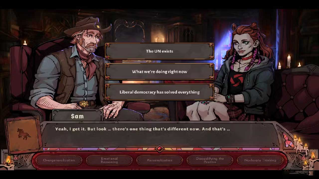 این نوع تحریف‌های شناختی به مکانیک مرکزی بازی تبدیل می‌شوند، جایی که شما باید تشخیص دهید که بیمار تحت کدام «نوع» تفکری برای گزیده‌هایی از مکالمه شما کار می‌کند. ایده هایی مانند شخصی سازی، تعمیم بیش از حد و تفکر سیاه و سفید به خوبی توضیح داده شده و نشان داده شده است، و نوشته درک بسیار خوبی از راه های مختلفی که انسان ها می توانند وارد الگوهای فکری منفی شوند را نشان می دهد.