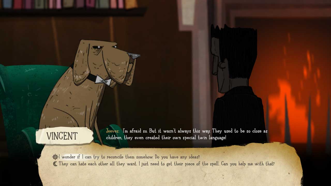 در عمل، اکثر انتخابهای «خوب» شامل تعامل با NPCها است، در حالی که انتخابهای «بد» راهحلهای مبتنی بر موجودی آیتم ها بیشتری را برای موانعی که بر سر راه شما قرار میگیرند به شما ارائه میدهند. این یک برداشت تازه از ژانر نقطه و کلیک است و به همین علت گیم پلی Whateverland هرگز احساس قدیمی بودن نمی کند. همچنین این ویژگی کمک میکند که انواع مینیبازیها در قالب پازل به خوبی پیادهسازی شوند و تجربه یکنواخت را از بین ببرند. در واقع تلاش قابل توجهی برای این پازل های مبتنی بر مینی بازی انجام شده است، که برجسته ترین بخش استراتژی رومیزی نوبتی است که در زیر نشان داده شده است که عنوان آن Bell and Bones است. اگر واقعاً طرفدار گیمپلی استراتژی نوبتی نیستید، میتوانید از کل این بخش صرفنظر کنید، مشروط بر اینکه به اندازه کافی از یک منبع خاص جمعآوری کرده باشید.